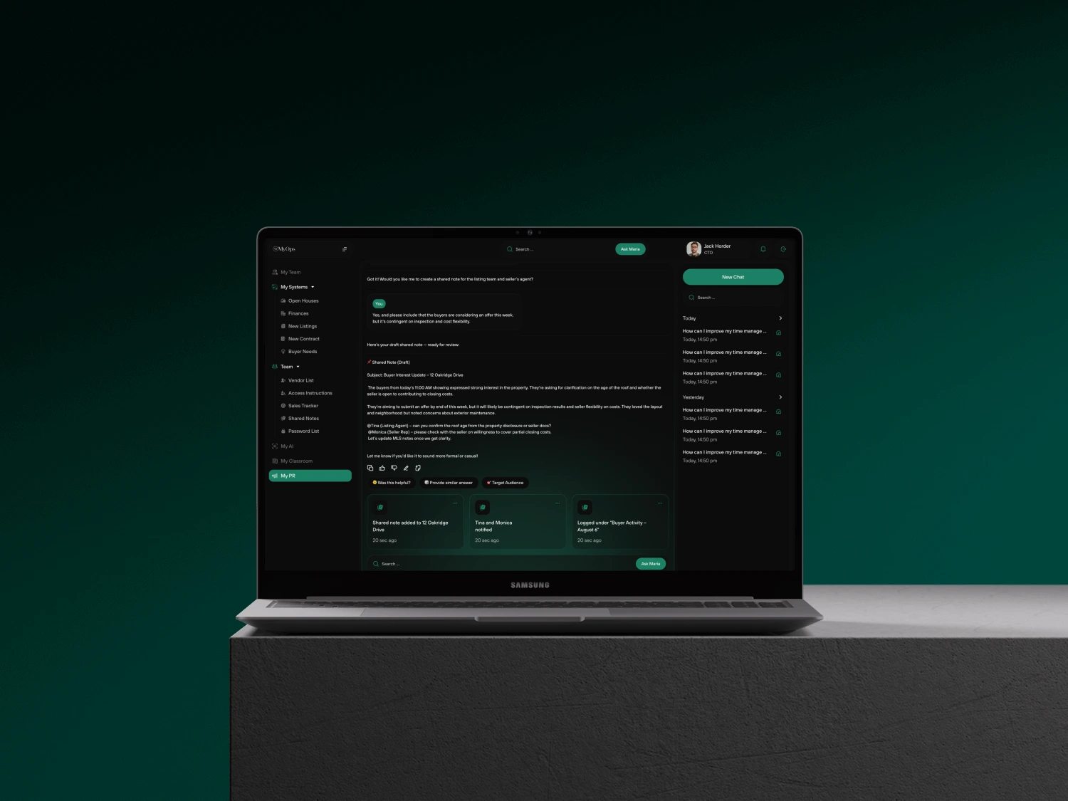At the heart of MyOps is MyAI, the intelligent system that ensures you always have the information you need—instantly and effortlessly. MyAI delivers real-time financial data and team performance insights so you can make informed decisions without digging through spreadsheets or reports. Whether you need to check sales volume, expenses, agent productivity, or deal progress, MyAI pulls the data instantly and presents it in a clear, actionable format.Beyond analytics, MyAI acts as your real estate command center, giving agents instant access to property details, passwords, gate codes, vendor contacts, and all critical information in one secure location. Instead of searching through notes or calling team members for details, everything is available in seconds, keeping your transactions and team operations running smoothly. With AI-powered automation, MyAI ensures that every piece of essential information is just a quick search away—so you can stay focused on selling, strategizing, and scaling your business.